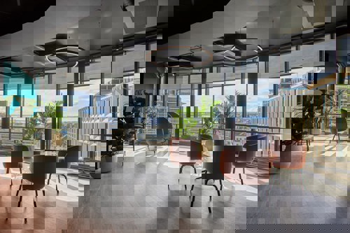 Etasjen har sosiale soner med fantastisk utsikt og kjøkken med spiseplass. I eiendommen er det nyoppusset kantine, betjent resepsjon, treningsrom og innendørs sykkelparkering. Kantine og treningsrom er ekstra tjenester som man betaler en fast sum pr. mnd for å bruke. I kantine kan man også kjøpe mat pr. dag.